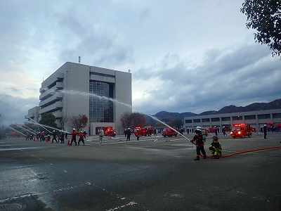 令和6年12月8日(日)、加西消防署と加西市消防団は、市役所の東側駐車場で市街地合同訓練を行いました。