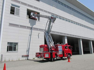 また、2階部分に逃げ遅れた従業員がいるとの想定で、屈折はしご付消防車を使って救出し、救急車で搬送する訓練を合わせて実施しました。