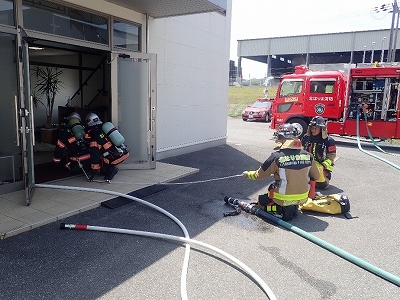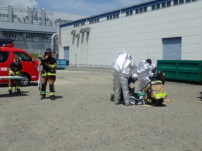 初めに、事業所職員による通報訓練、避難訓練、初期消火訓練が行われ、その後の消防隊との総合訓練では、建物火災に対する放水、逃げ遅れ者の検索救出活動、危険物火災を想定した耐熱服の着装を実施しました。