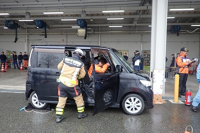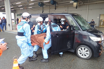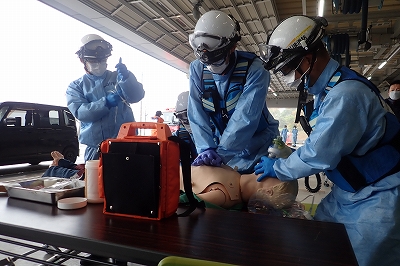 訓練想定は、「現場は道路上、通行人からの通報、軽自動車の単独事故により、運転手の男性1名が、胸の痛みを訴えているもの。会話及びドアの開放は可能、挟まれ等はなし。」という指令により、消防隊と救急隊が連携し、傷病者の救出活動を行い、その後、心肺停止となった傷病者に対し、質の高い胸骨圧迫の実施、早期の点滴確保及び早期の薬剤(アドレナリン)投与を行いました。