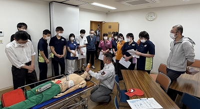 この訓練は、救急事案発生時の施設職員による適切な初動対応力(119番通報や応急手当)の向上及び現場へ到着した救急隊との連携強化を目的に実施しました。