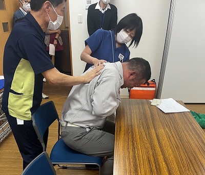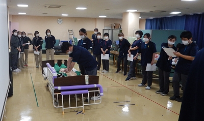 入所者の窒息時の対応、施設職員による119番通報、心肺蘇生法、関係者への連絡、救急隊への引継ぎ、救急隊が実施する救急救命処置の説明といった内容で訓練を実施しました。