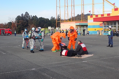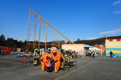 訓練想定は、加東市黒谷東条湖おもちゃ王国の屋外駐車場にて「イベント開催中に不審人物により液体をまかれた。」との通報で開始され、兵庫県警察による不審人物の検挙、北はりま消防組合の複数隊が負傷者の救出活動、除染活動、救急活動等を実施しました。