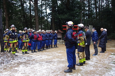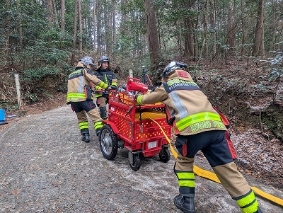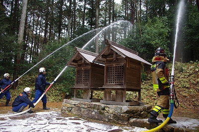 本訓練には、神社関係者、加東市消防団が参加し、万が一の火災発生時における初動対応と連携体制の確認を行いました。