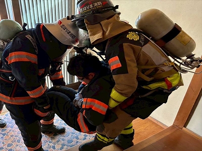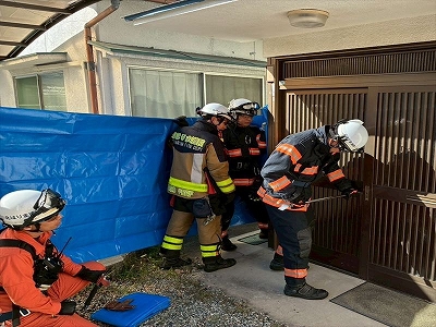本訓練は、近年多様化・複雑化する救助現場の状況に的確に対応するため、実際の建物を使用して行ったもので、玄関ドアの開放訓練や火災を想定した要救助者の救出訓練などを実施しました。