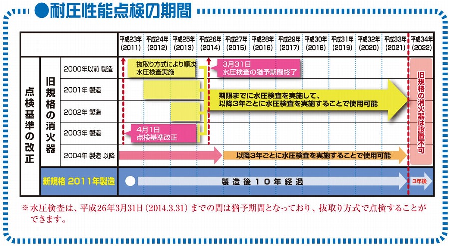 ※ この改正により、平成22年12月31日以前の規格に基づく消火器は消防法令に適合する消火器としての効力を失います。ただし、既に防火対象物に設置されているものについては、平成33年12月31日までは特例として設置が認められています。